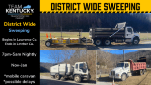 Sweeping will begin on the north end of the district in Lawrence County, progressing southward through Johnson, Martin, Floyd, Pike, Knott and ultimately Letcher County. The effort will include cleaning travel lanes, medians, and barrier walls along major four-lane corridors.